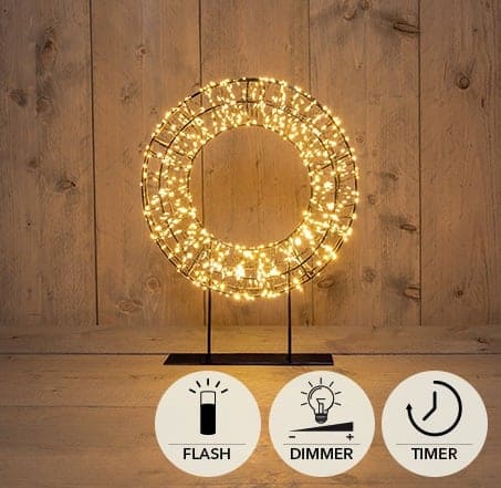 Der Kranz auf Fuß besitzt einen Timer und Dimmer. Er hat eine Zuleitung von 5m. Wenn man möchte, kann man die "FLASH Funktion" aktivieren.