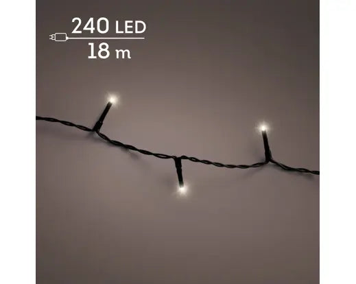LED Basic Lichterkette von Lumineo mit LED Technik in schwarz. Die Lichterkette hat eine Länge von 18 Metern und 240 warm weiße Lichter erstrahlen an ihr. Tolle Lichterkette für Eure Außendeko!